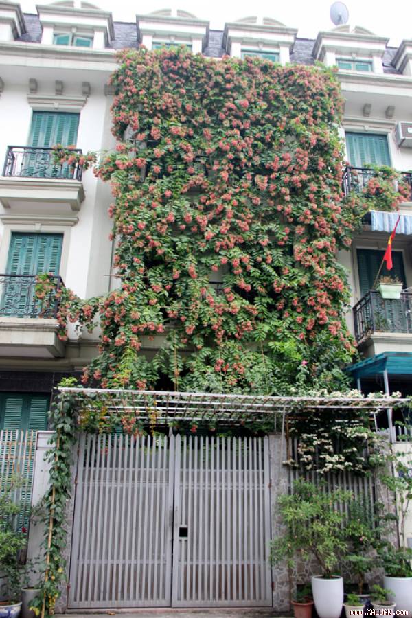 Chủ nhà trồng giàn hoa từ cây con cách đây 2 năm. Hiện tại, cây đã leo tới tầng ba, phủ kín nhà. Lúc đầu, ông Thủy đan lưới cho cây leo lên nhưng sau thấy không cần thiết, ông chỉ làm các sợi cáp dọc từ tầng 3 xuống để cây mọc bám lên.