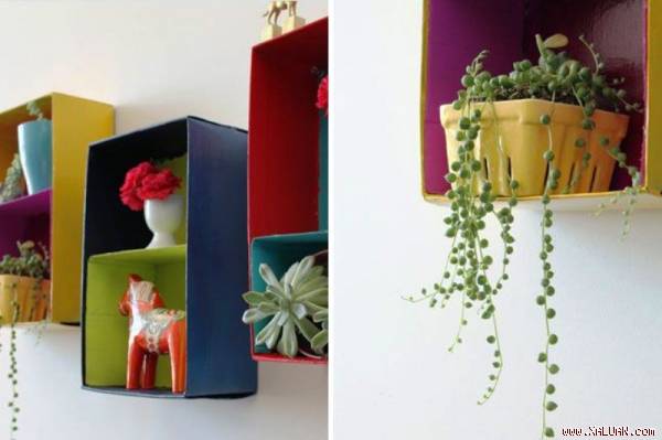 Những chiếc hộp đựng giày sau khi được dán giấy decal màu, hoặc giấy họa tiết vào và gắn lên tường có thể trở thành những chiếc kệ nhỏ trang trí nhà rất đẹp mắt.